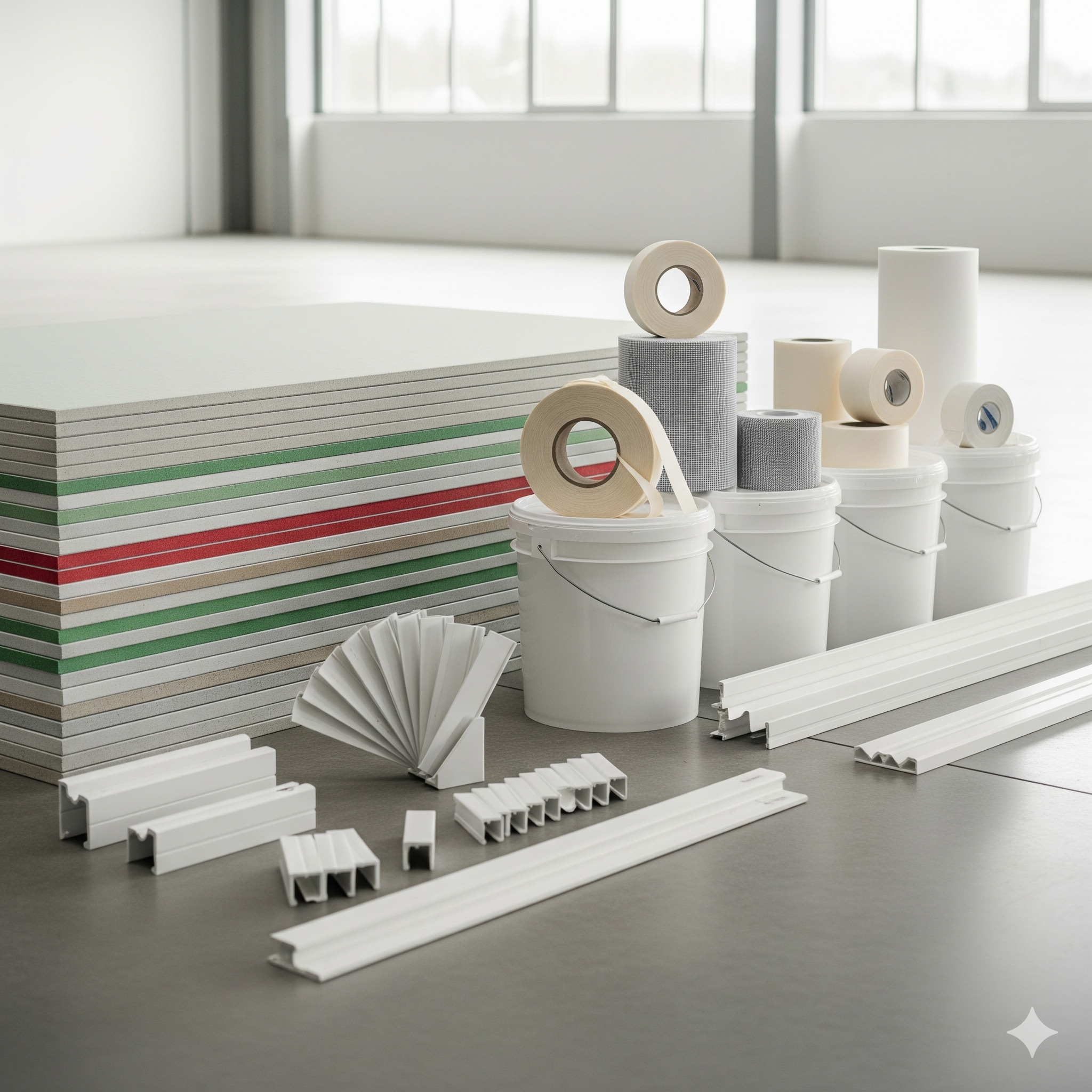 Standard, moisture-resistant and fire-rated boards with joint compounds, tapes and trims.